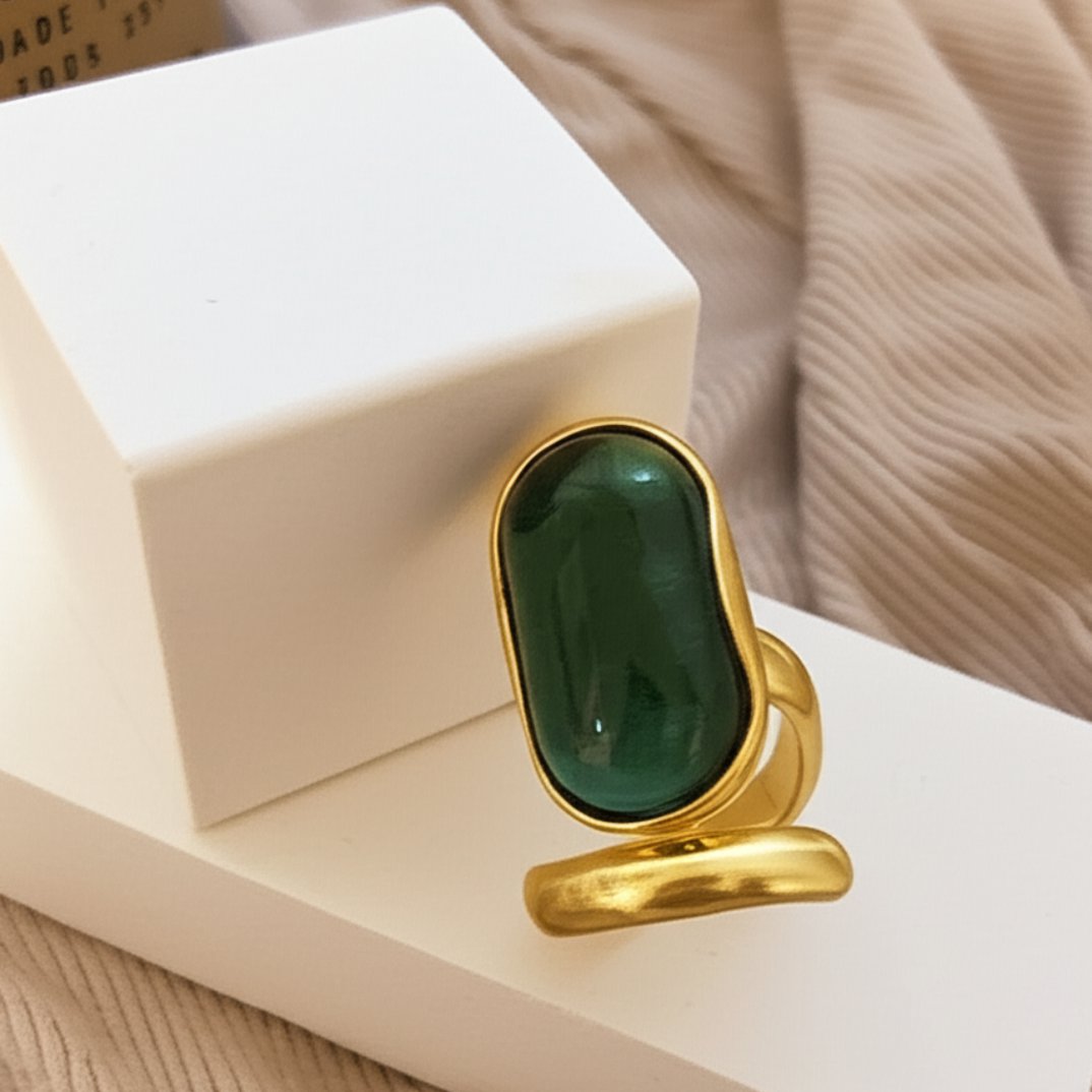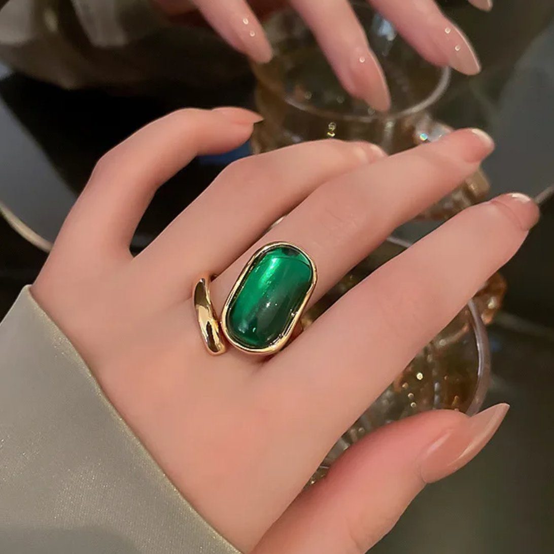 Anel Verde Grande de Pedra Retangular Ajustável Moderno