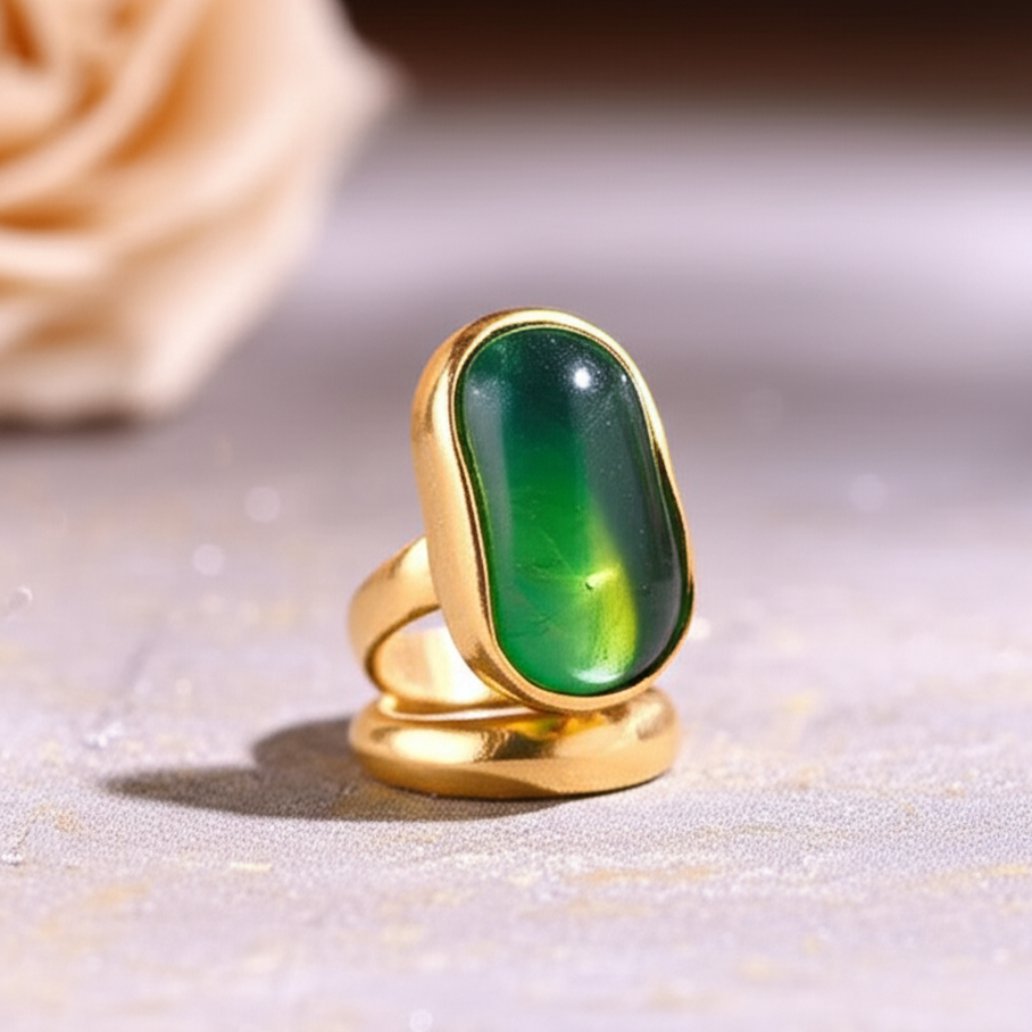 O verde da pedra representa crescimento, renovação e frescor, enquanto o dourado simboliza riqueza, sucesso e prosperidade. Juntos, esses elementos criam uma combinação poderosa que transmite confiança e estilo único.