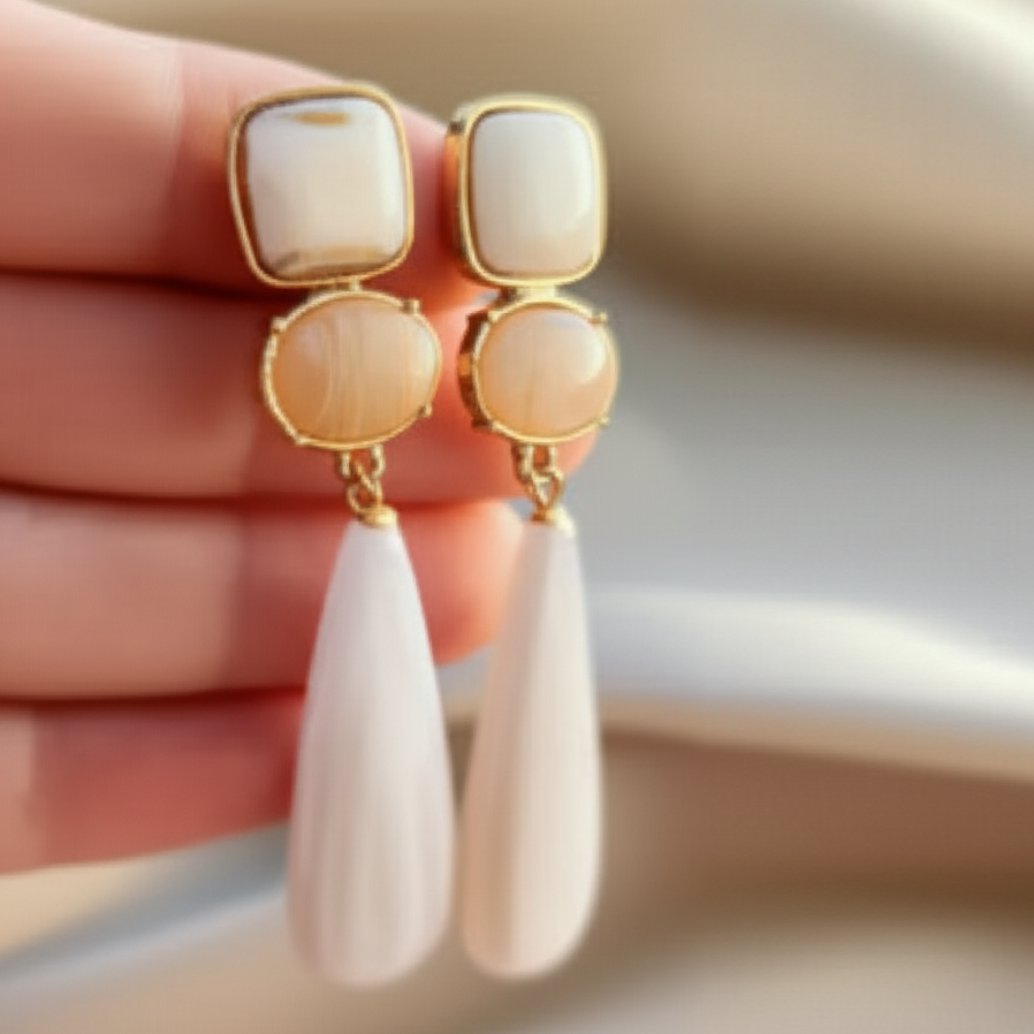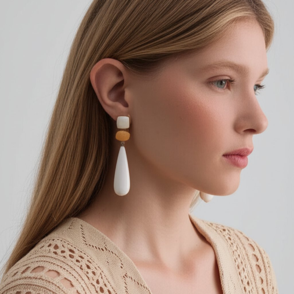O Brinco Branco Grande de Pedra com Bege e Gota é o acessório perfeito para adicionar um toque de elegância e sofisticação ao seu visual. Com seu design arrojado e moderno, este brinco é uma verdadeira declaração de estilo.