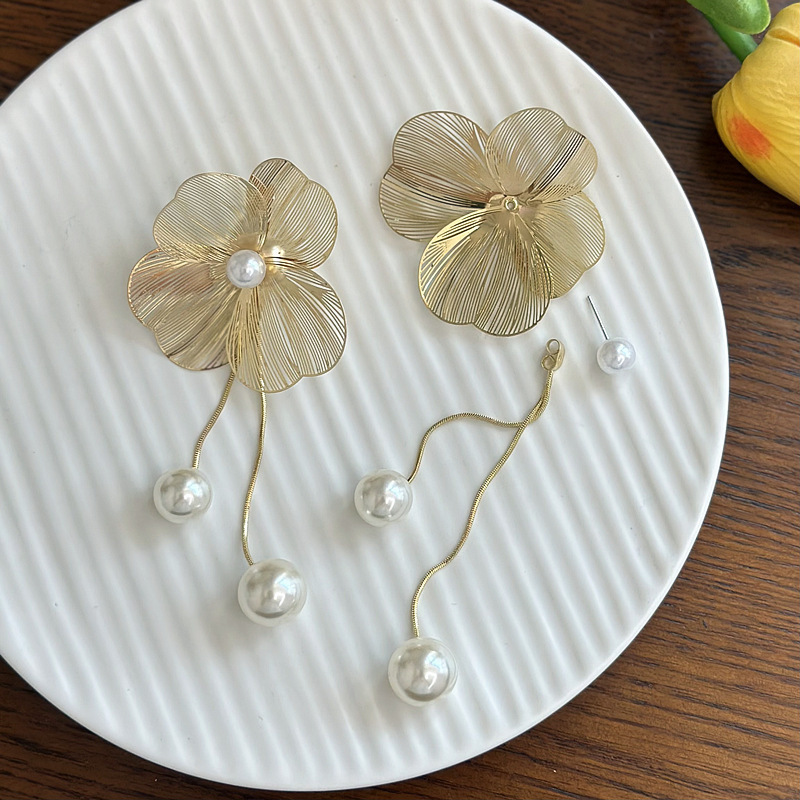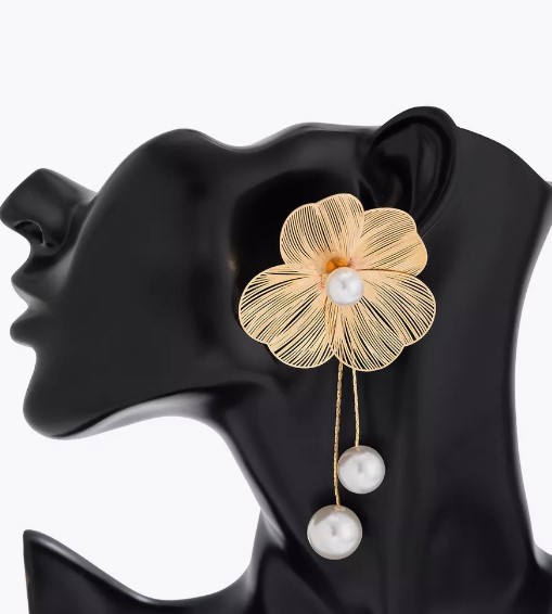 Brinco de Flor Dourada Com Pérola e Franja de Pérolas Para Festa ao Ar Livre