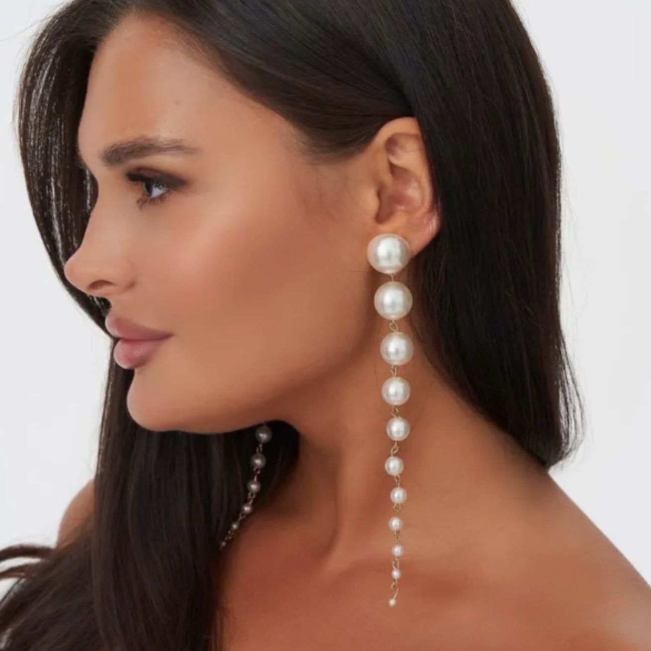As pérolas, símbolos de pureza e beleza, adicionam um toque de luxo e feminilidade a qualquer look. O comprimento longo e fino do brinco ajuda a alongar o pescoço, criando uma silhueta elegante e refinada.