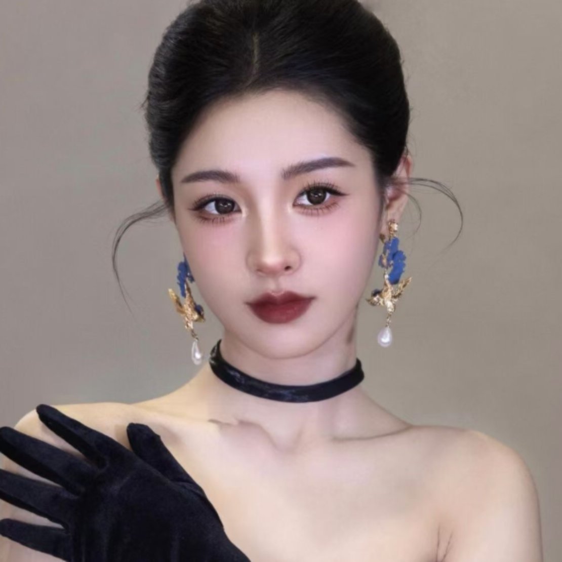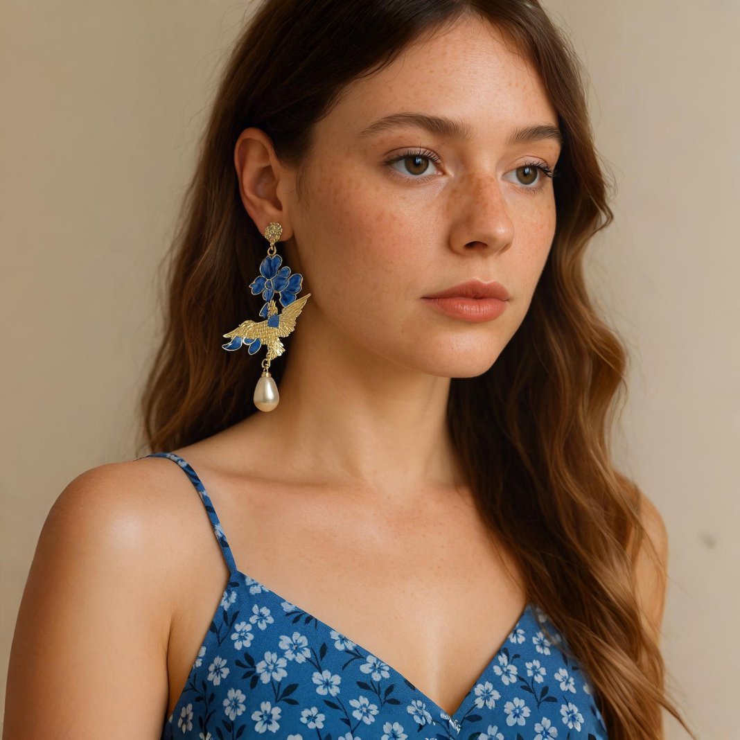 Brinco de pressão azul e dourado grande inspirado na elegância oriental de pássaros exóticos. Este brinco exuberante e extravagante combina a beleza da natureza com um toque de sofisticação. Com uma flor abstrata em tons de azul e um pássaro majestoso carregando um pingente de pérola, esta peça é verdadeiramente única e deslumbrante.
