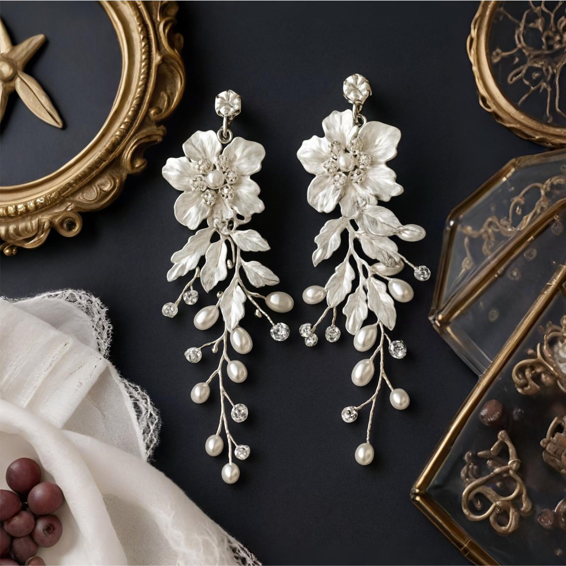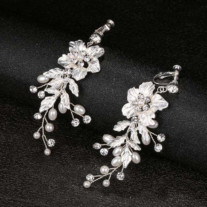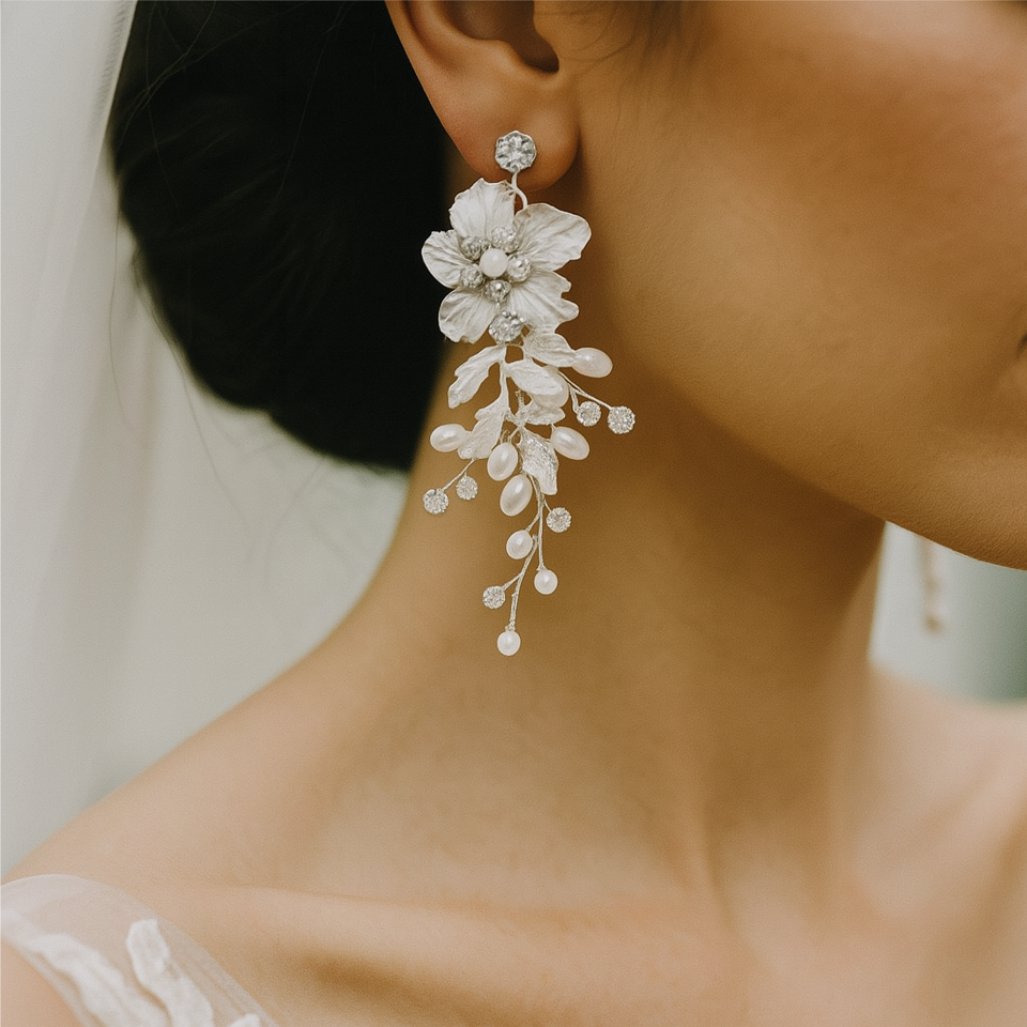 Brinco de Pressão Branco de Noiva Com Flores e Pérolas Elegante