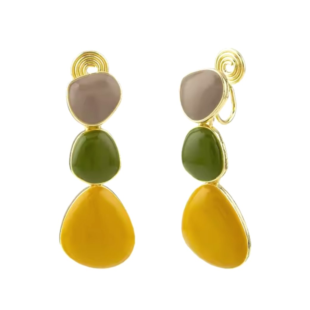 Além de sua beleza, este brinco também transmite uma aura de distinção e classe. O verde oliva traz consigo uma sensação de tranquilidade e equilíbrio, enquanto o toque de mostarda adiciona um toque de vivacidade e energia. O cinza, por sua vez, confere um ar de elegância discreta, completando a paleta de cores de forma harmoniosa.