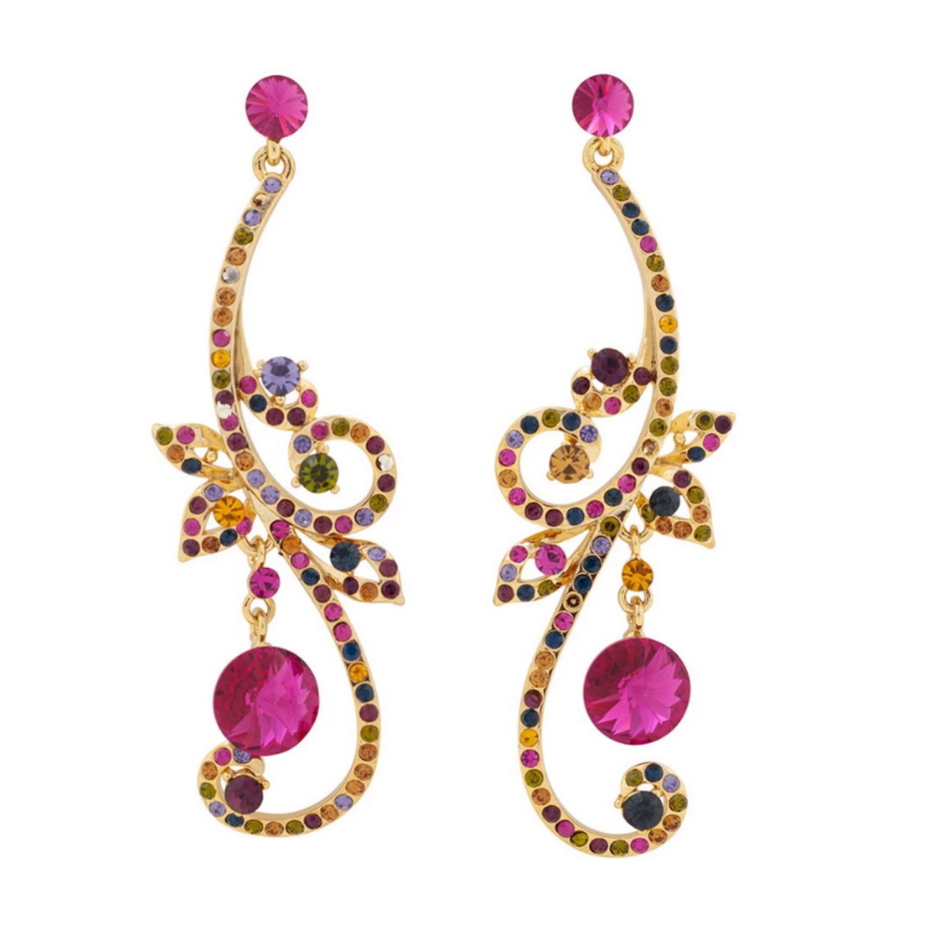 Escolha este brinco fúcsia e verde de festa longo arabesco para adicionar um toque de cor e elegância ao seu visual de festa. Seja ousada, seja confiante e arrase com este acessório deslumbrante.