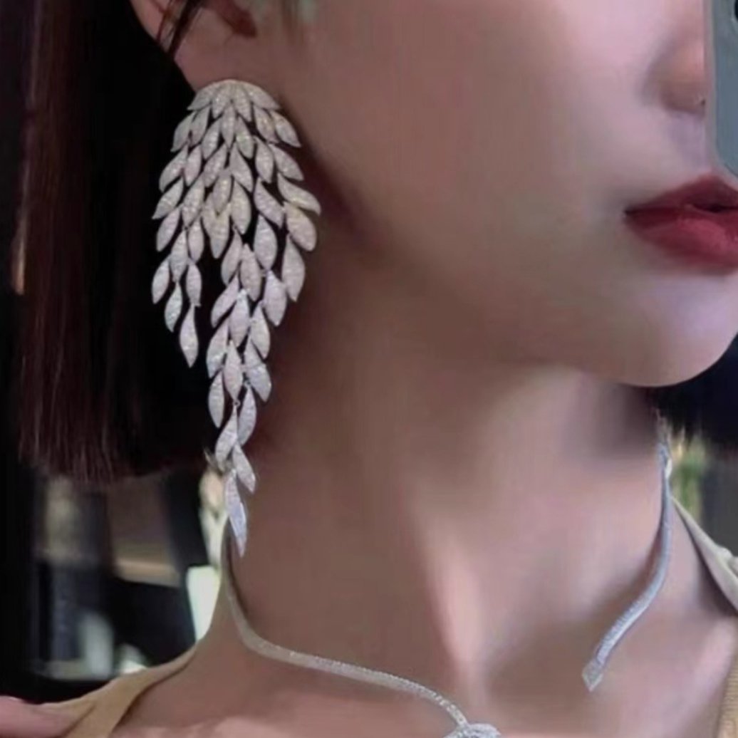 Brinco prata de festa luxuoso de zircônias ramo de folhas