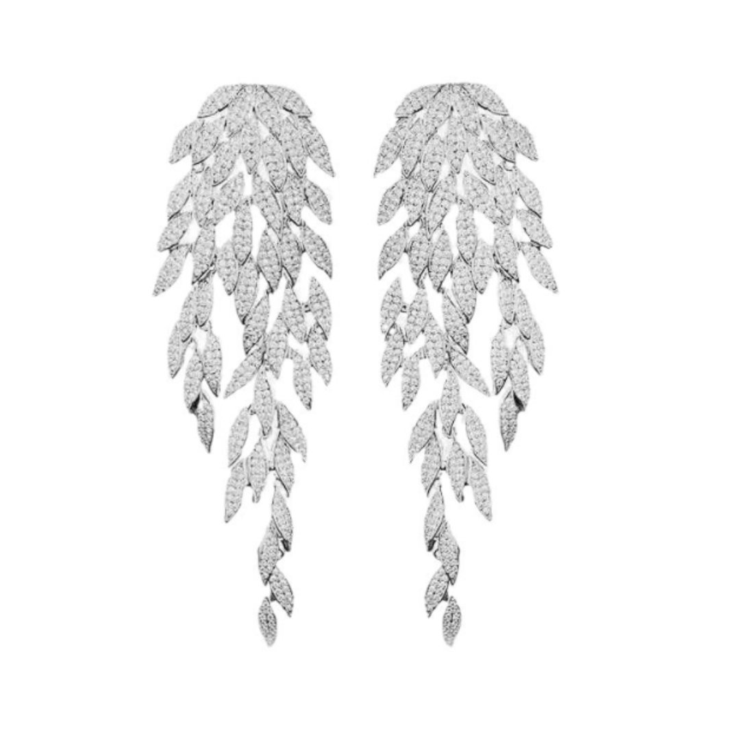 brinco prata de festa luxuoso de zirconias ramo de folhas
