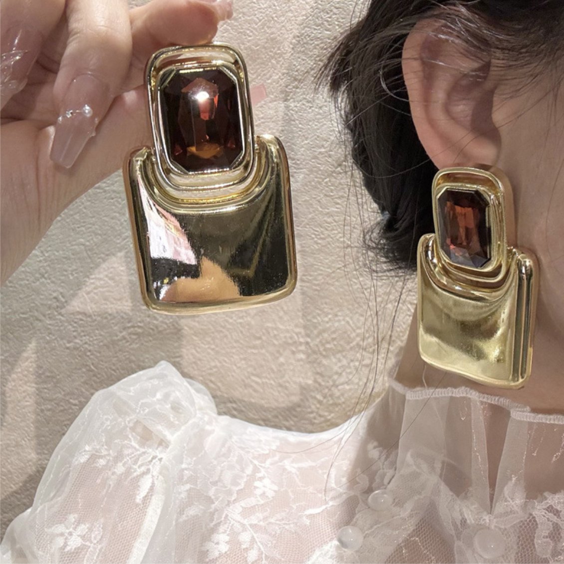 A cor marrom e dourada trazem um toque de glamour e sofisticação, enquanto o formato quadrado adiciona uma dose extra de modernidade. O fecho de pressão garante praticidade e conforto ao usar o brinco, tornando-o uma opção versátil para diversas ocasiões.