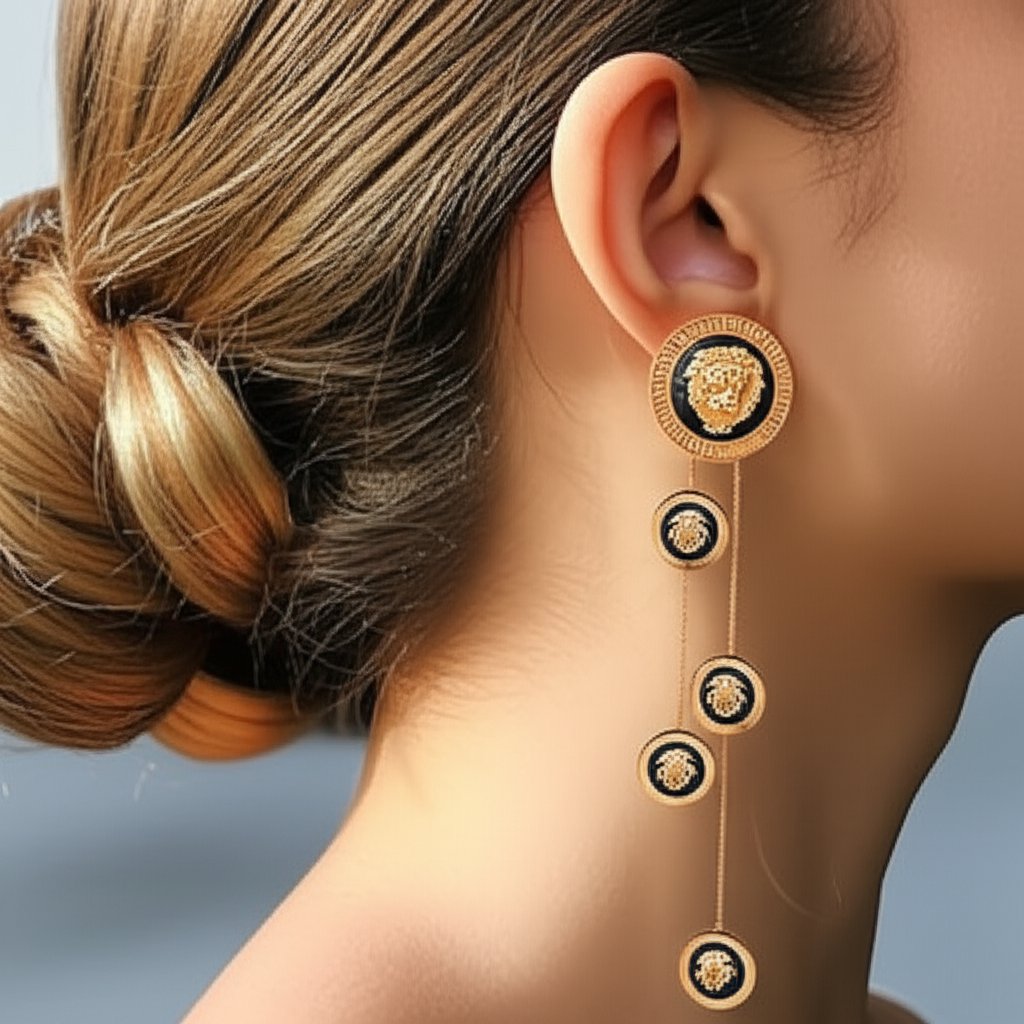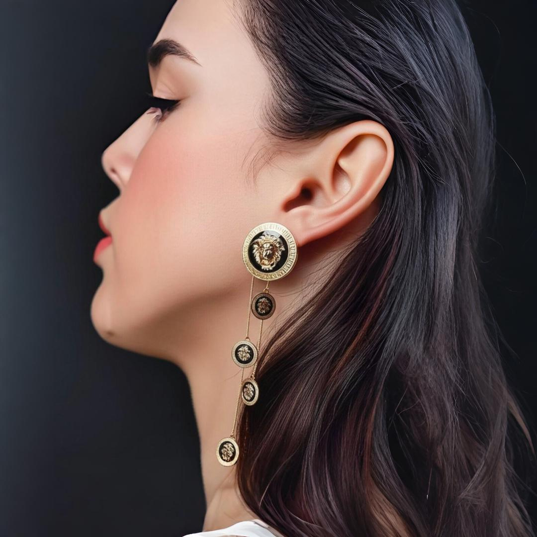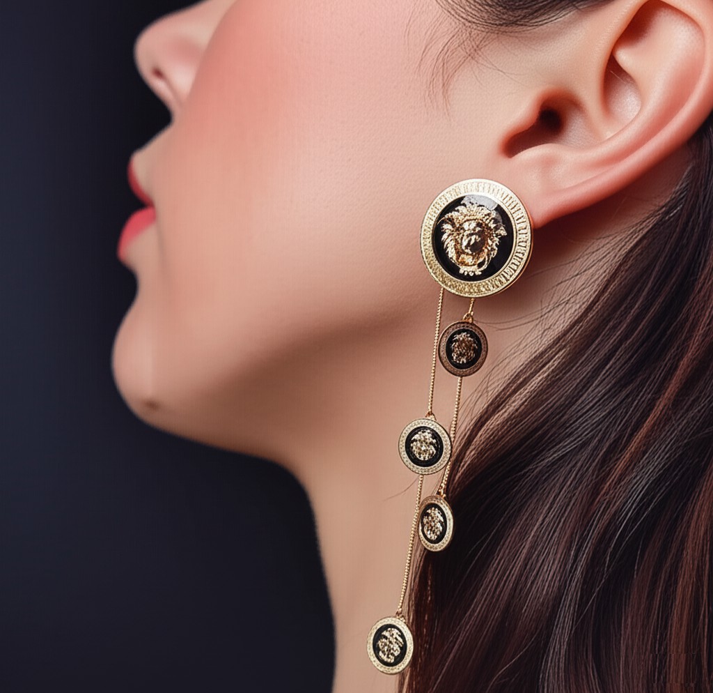 Destaque o seu estilo com o Brinco Maxi Dourado e Preto, uma joia cheia de personalidade e sofisticação. Ele apresenta um design exuberante, formado por várias moedas penduradas, cada uma exibindo uma cabeça de leão em alto-relevo, símbolo de força, nobreza e poder.