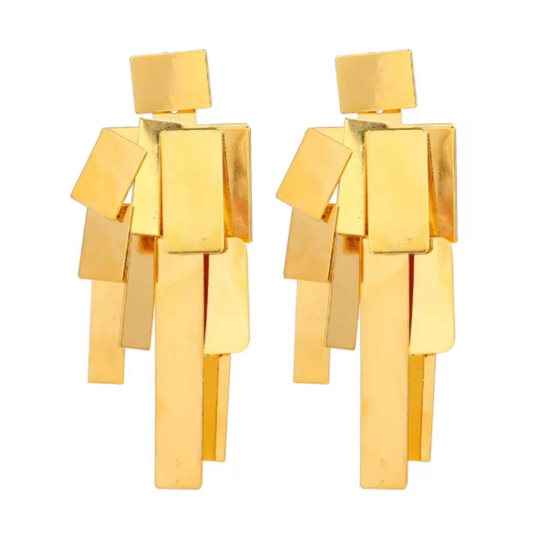 As múltiplas placas retangulares em tom dourado conferem um brilho único a esta peça, garantindo que você se destaque em qualquer ocasião. Seja para um evento especial ou simplesmente para adicionar um toque de glamour ao seu look diário, este brinco é a opção ideal.