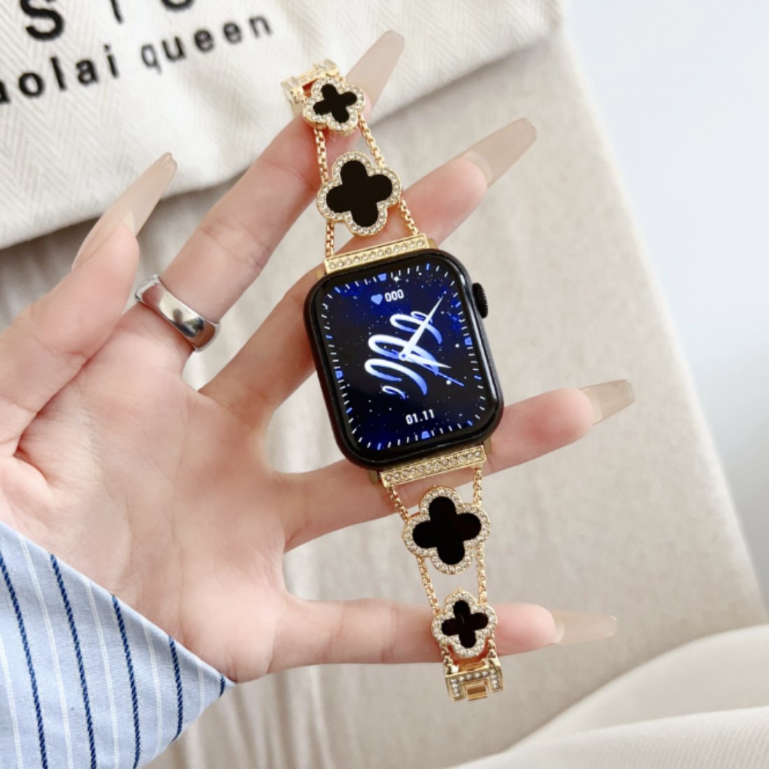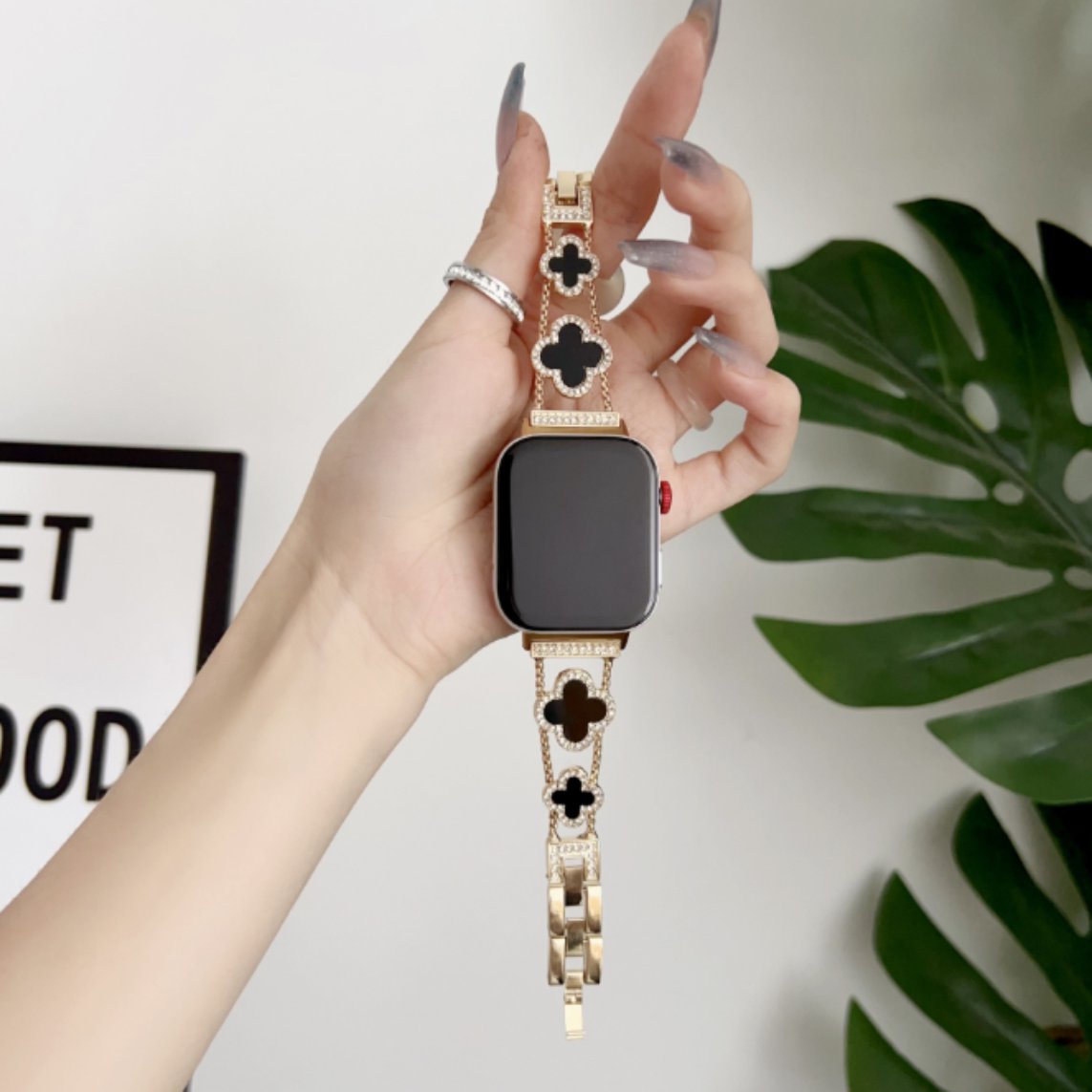 Esta pulseira para Apple Watch de Trevo Preto Cravejada de Cristais em aço inoxidável dourado é simplesmente deslumbrante! Com sua elegância e brilho, ela vai transformar o seu Apple Watch em um acessório de moda chic e sofisticado.