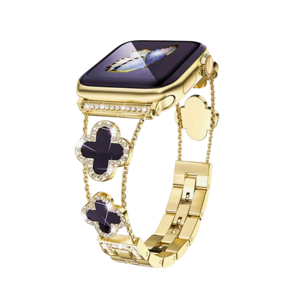 Esta pulseira para Apple Watch de Trevo Preto Cravejada de Cristais em aço inoxidável dourado é simplesmente deslumbrante! Com sua elegância e brilho, ela vai transformar o seu Apple Watch em um acessório de moda chic e sofisticado.