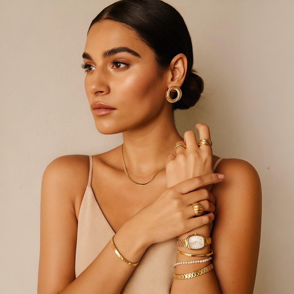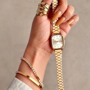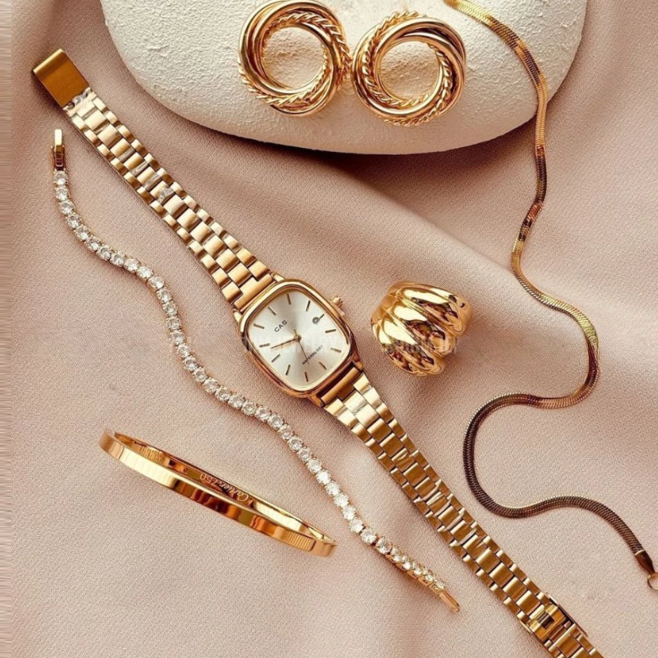 O relógio dourado adiciona um toque de classe ao pulso, enquanto a pulseira complementar completa o look com elegância. O anel e brinco a condizer acrescentam um toque de glamour adicional, tornando este conjunto verdadeiramente deslumbrante.