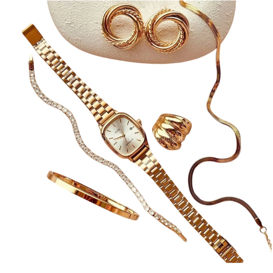 O relógio dourado adiciona um toque de classe ao pulso, enquanto a pulseira complementar completa o look com elegância. O anel e brinco a condizer acrescentam um toque de glamour adicional, tornando este conjunto verdadeiramente deslumbrante.
